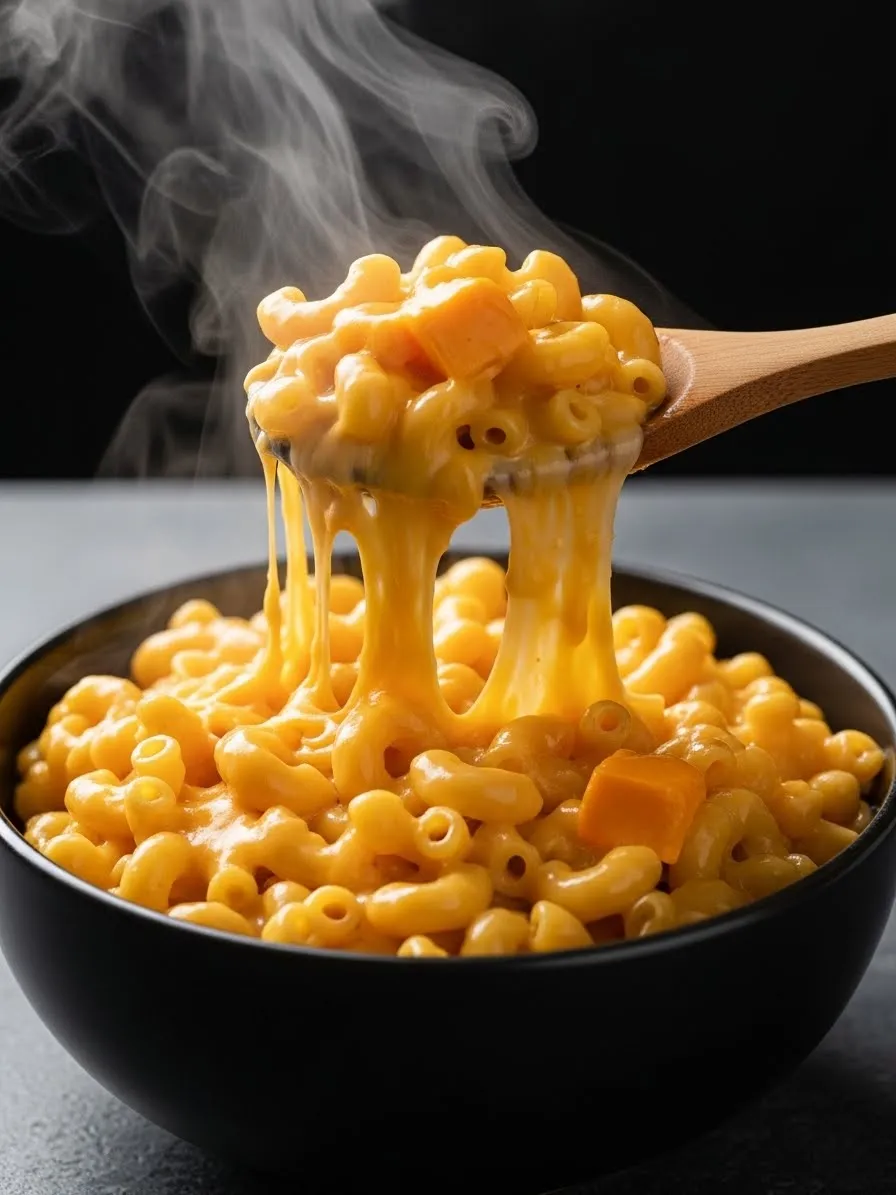Creamy cheese sauce coats every single noodle in this classic stovetop dish. Steam rises from the dark bowl as a wooden spoon lifts a generous portion of golden pasta. You can see the thick strings of melted cheese stretching from the spoon back into the bowl. Large cubes of cheddar sit nestled among the elbow macaroni to provide extra bursts of flavor in every bite.