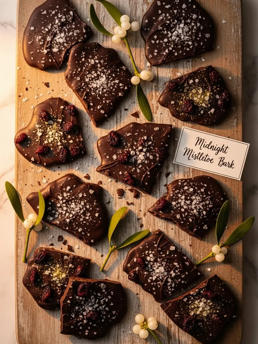 Dark chocolate shards rest elegantly on a rustic wooden board, catching the warm glow of holiday lights. Each piece features a generous dusting of coarse sea salt and tart dried cranberries. This treat looks sophisticated yet remains one of the simplest sweets you can whip up in minutes.
