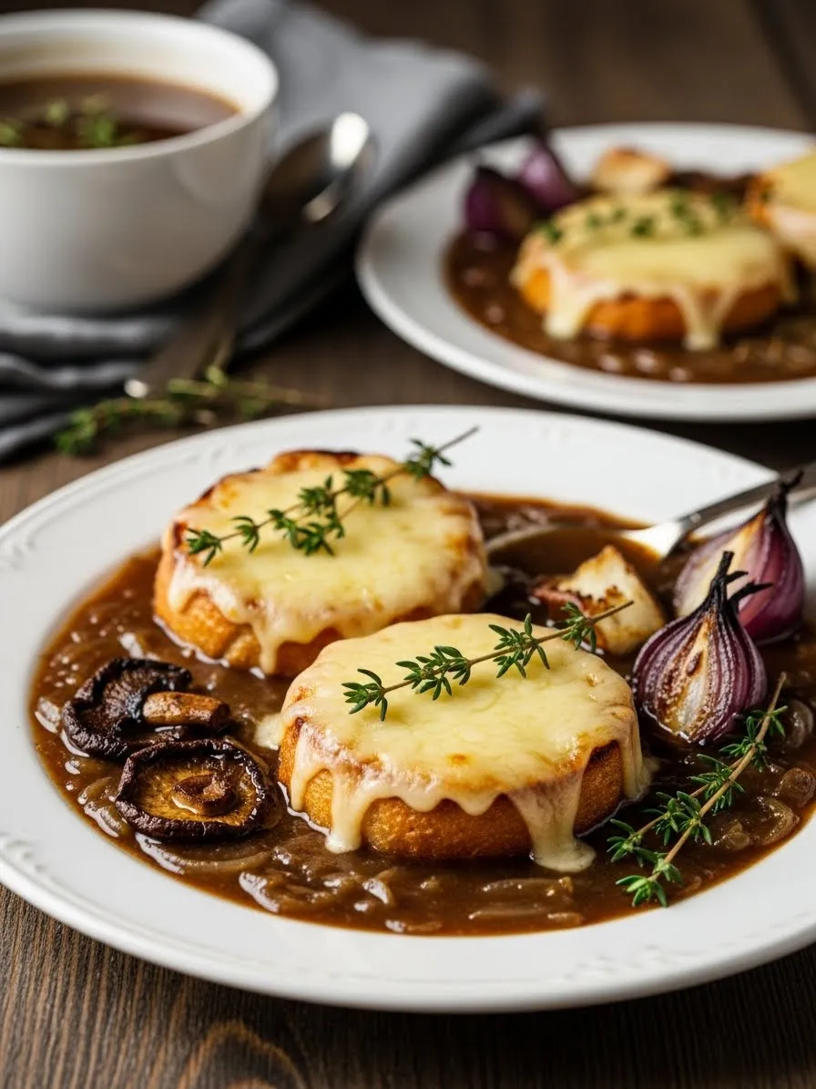 The photograph immediately draws you in with its promise of deep, savory flavor, showing a rich brown broth brimming with caramelized onions. Two thick slices of toasted bread, lavishly covered in melted, bubbly Gruyère cheese, rest right on top of the fragrant soup. Garnished with fresh thyme sprigs and surrounded by glistening shiitake mushrooms and roasted red onions, this bowl is truly a warm invitation.
